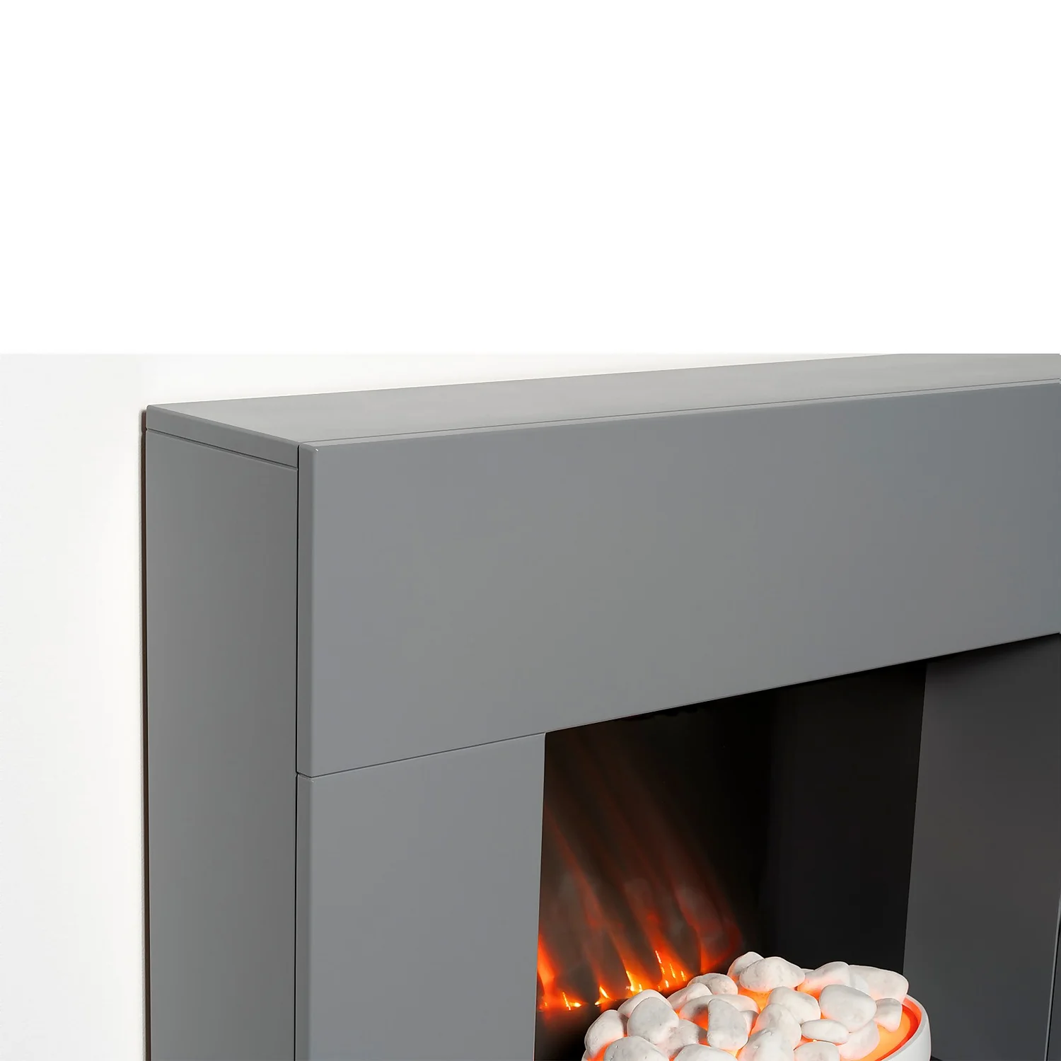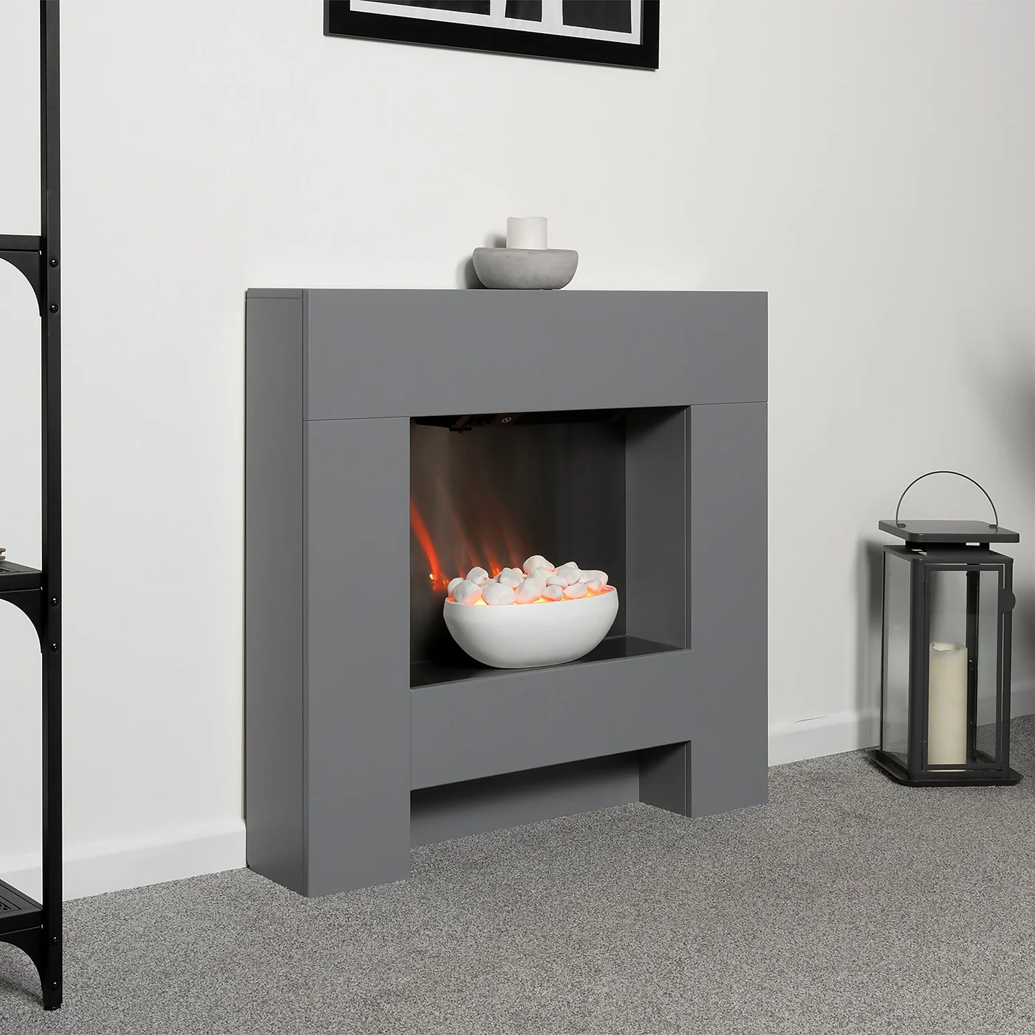 The Adam Cubist Fireplace Suite is a modern fire in every sense of the word. The eye-catching, hollowed out cube holds an electric fire that simmers gently in a bowl of pebbles. The straight, grey lines of the surround have a decidedly minimalist allure.