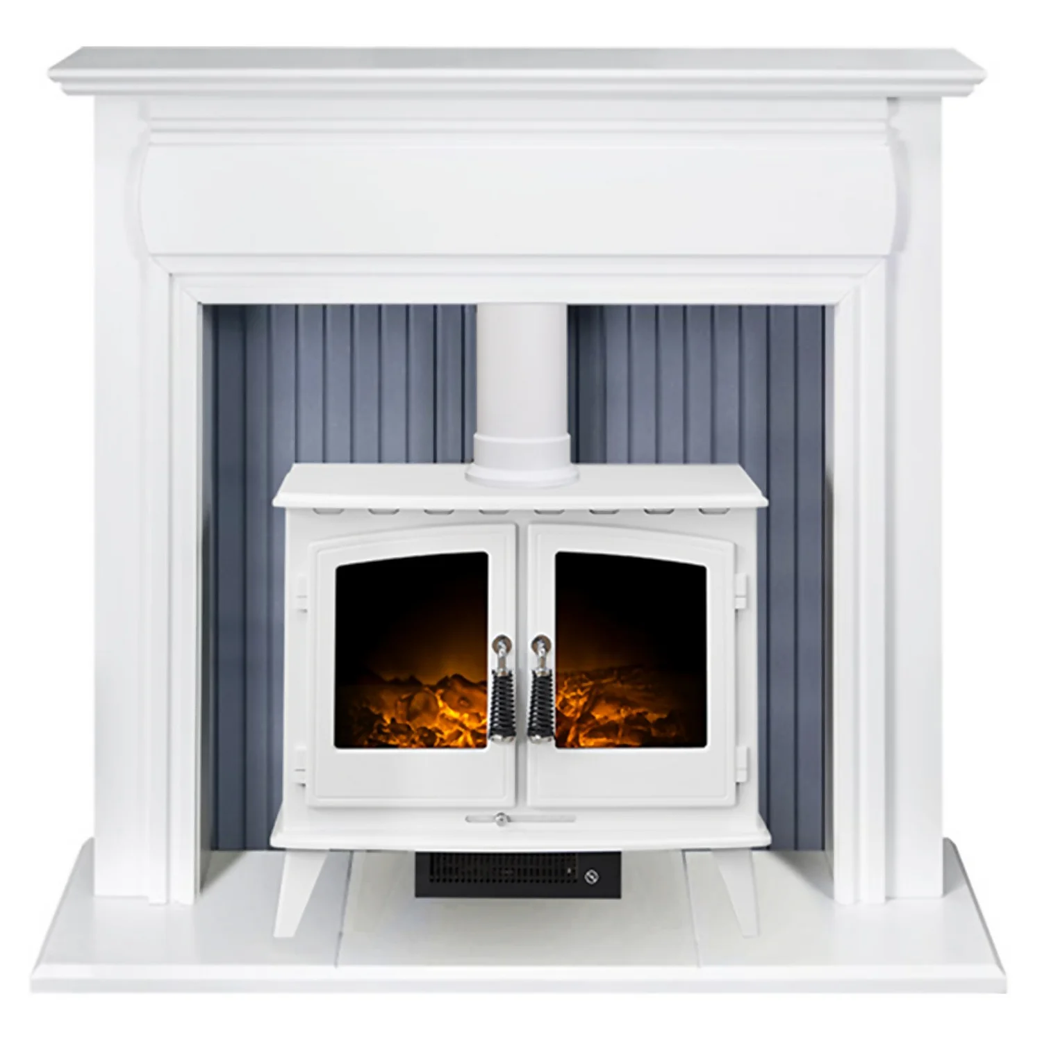 The Adam Florence electric stove suite white surround is combined excellently with the grey back panel. The supplied Adam Woodhouse electric stove provides a heat output of 0.9kW and 1.8kW and also features an LED flame effect only option. The controls are located on the side of the stove along with the thermostat, the stove is also complemented by the white straight stove pipe.