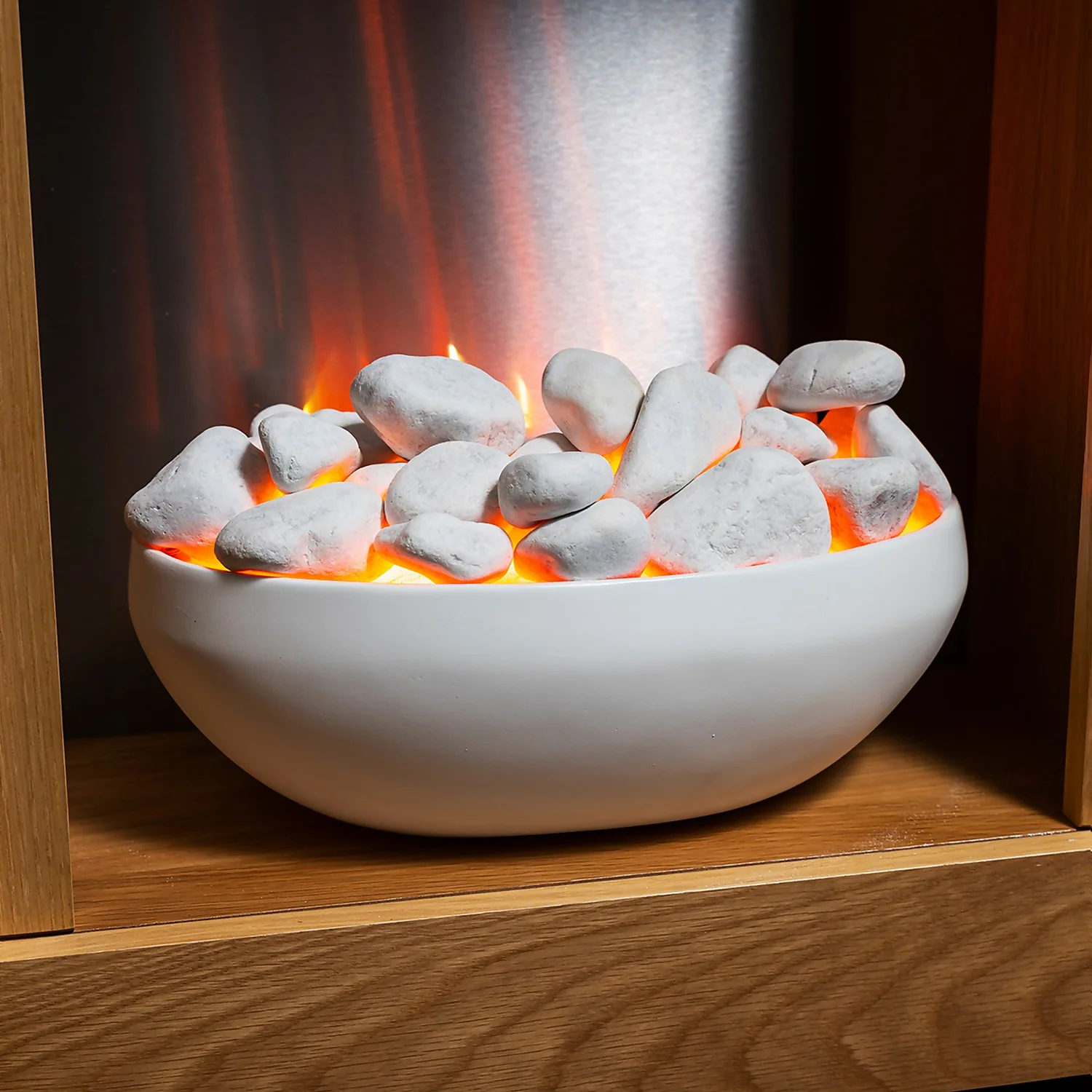 The Adam Monet electric suite is eye-catching and stylish, the insert holds an electric fire that simmers gently. The straight, oak lines of the surround have a decidedly minimalist allure, and combine with the white colour of the bowl and delicately glowing embers to lend your home an attractive, contemporary quality.