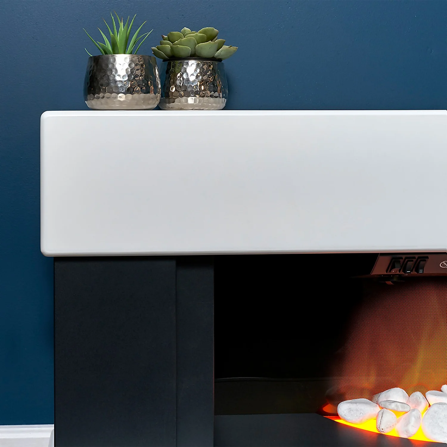 The Adam Verona is an exciting, contemporary electric fireplace suite designed specifically to be situated beneath a wall mounted television. The brilliantly white mantle and hearth contrast strikingly with the charcoal effect bed, and the glowing, ribbon flame effect fire burns merrily in the centre.