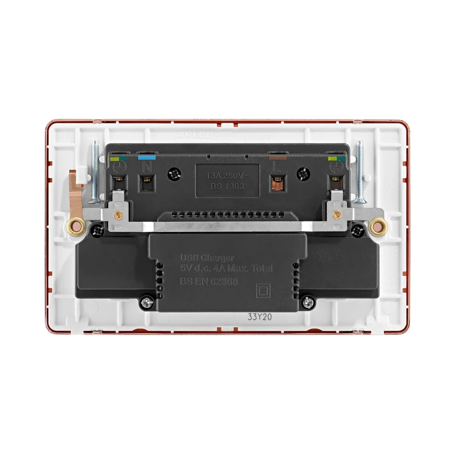 Be on trend with the Fusion Rose Gold switched socket. The premium metal font plate has a sophisticated copper rose tone and is screwless and removable which is handy when you come to decorate. Terminals are colour coded with captive screws to aid installation