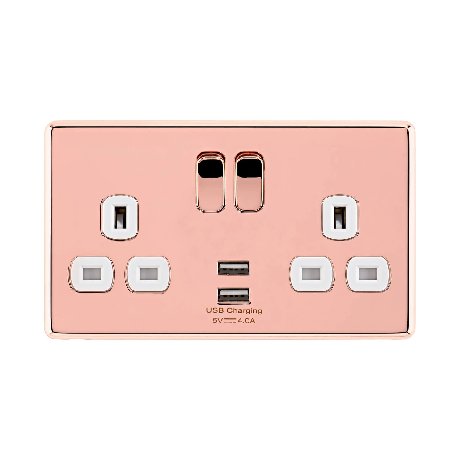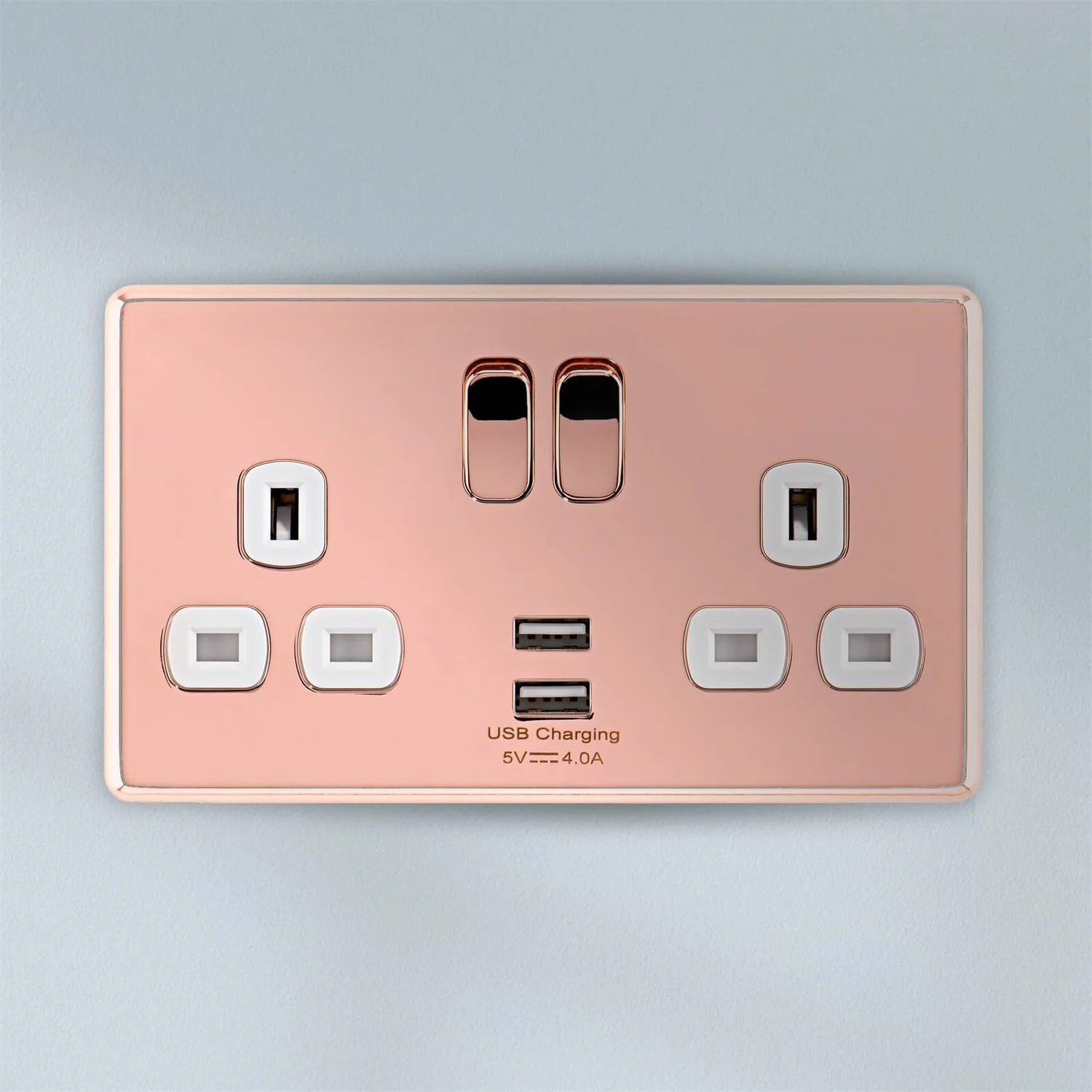 This product is a 13amp 2 gang switched socket with 2 x 4A USB. Complete the look with other Fusion electrical switches and sockets available in Rose Gold