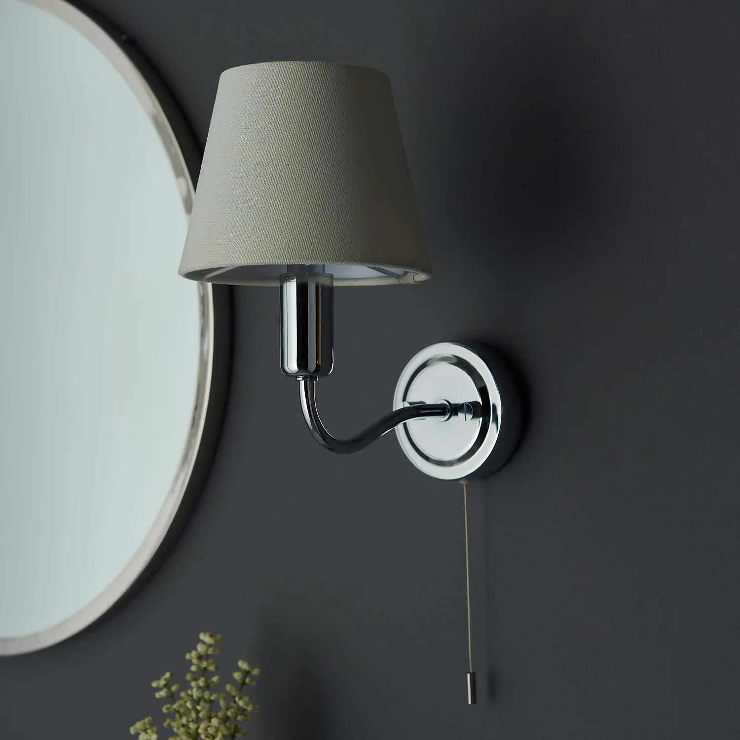 This chrome curved arm wall light with ivory shade is IP44 rated and suitable for bathrooms to get a timeless modern look.