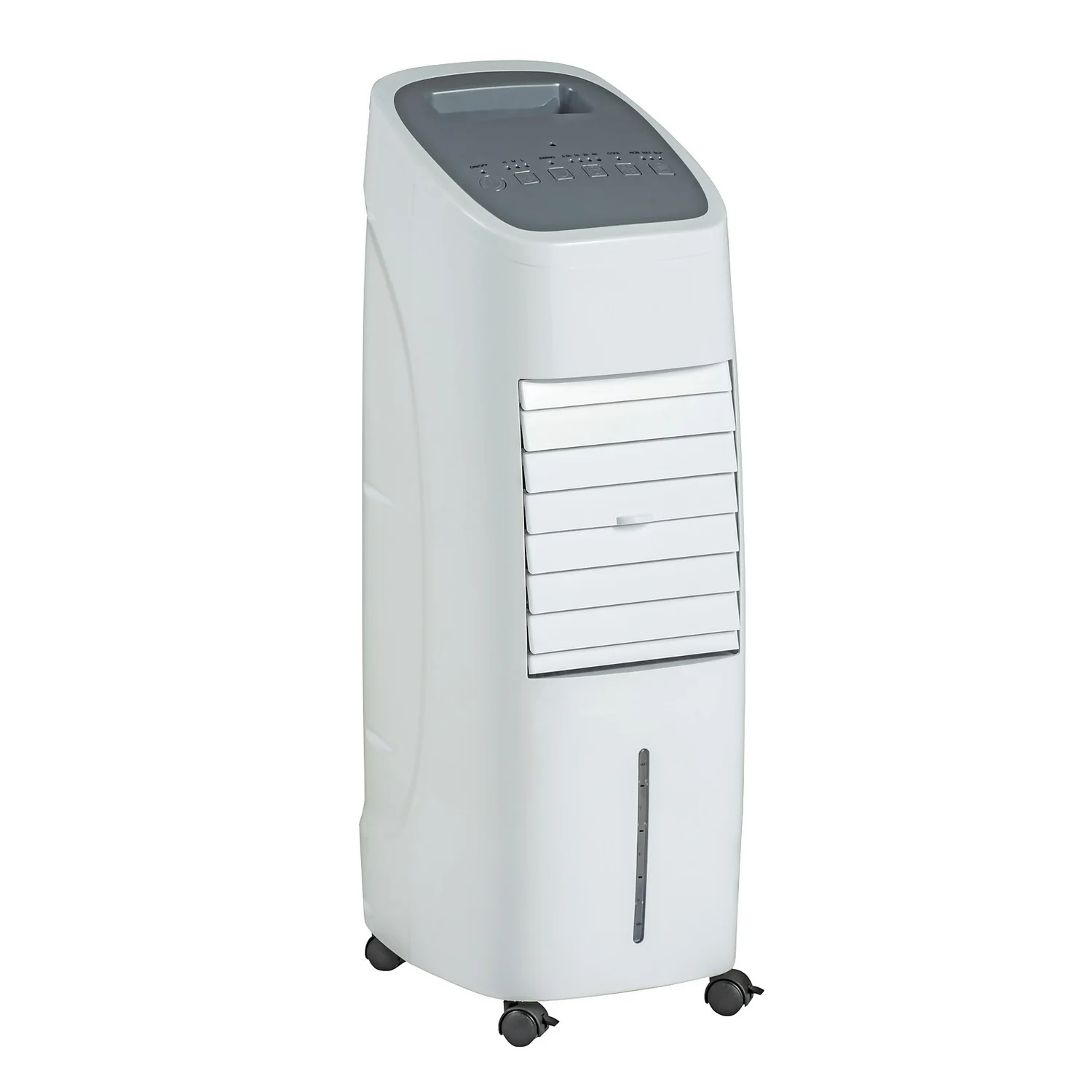 Powerful 3 speed air cooler, featuring an electronic soft touch control panel and remote control. Uses water and ice blocks to cool.