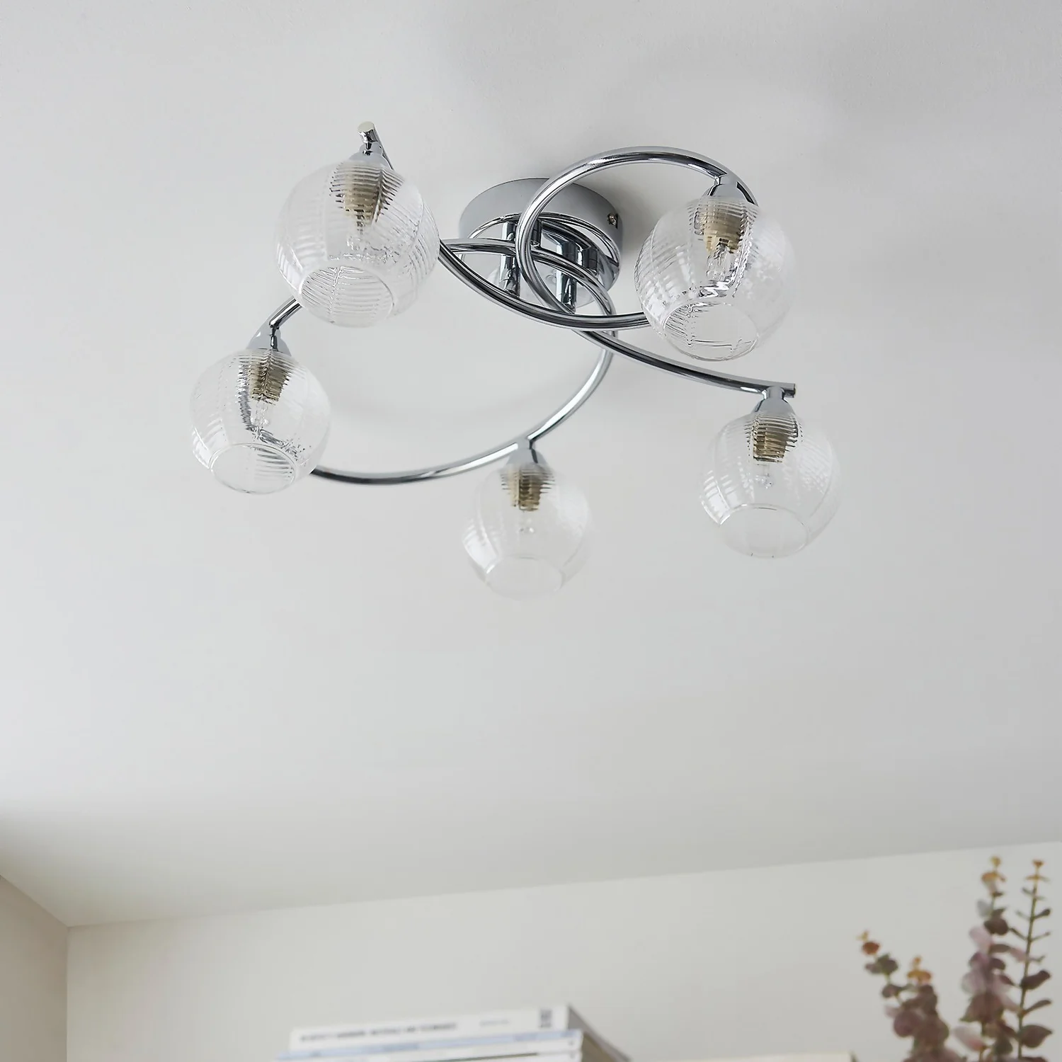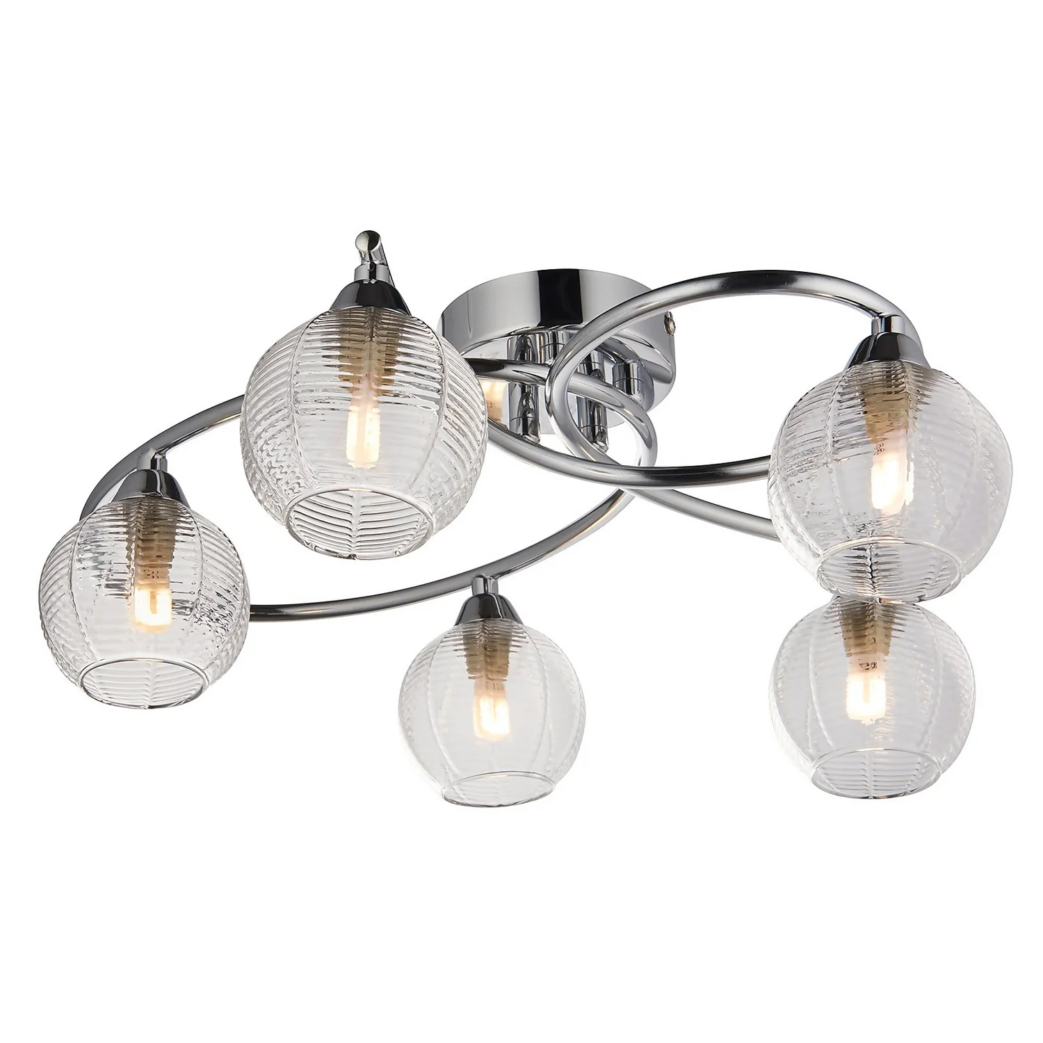 A lovely modern scluptural ceiling light. Chrome plated with complementary clear ribbed glass which creates a beautiful light effect when lit.