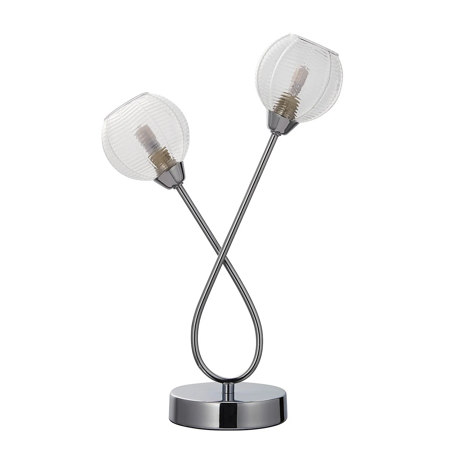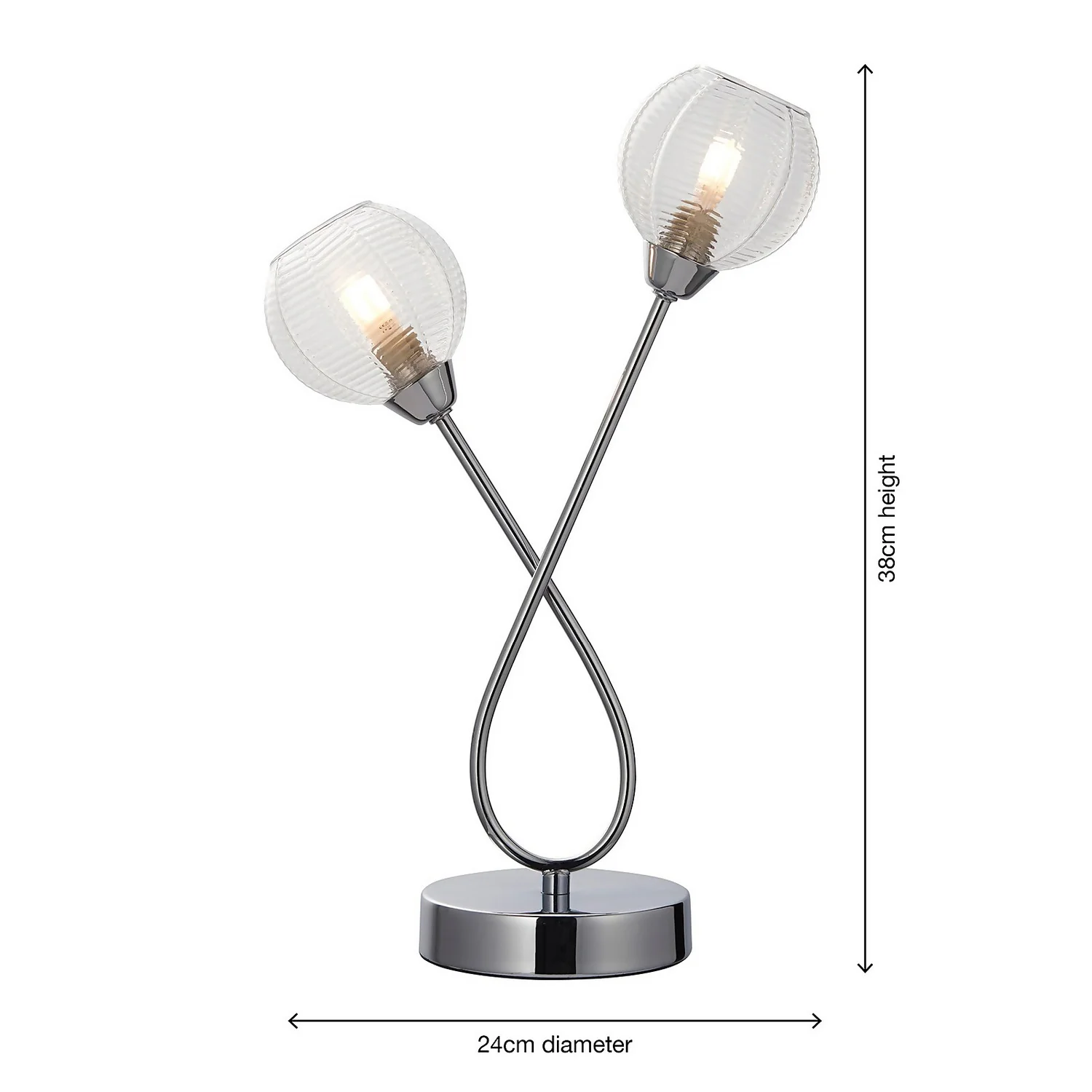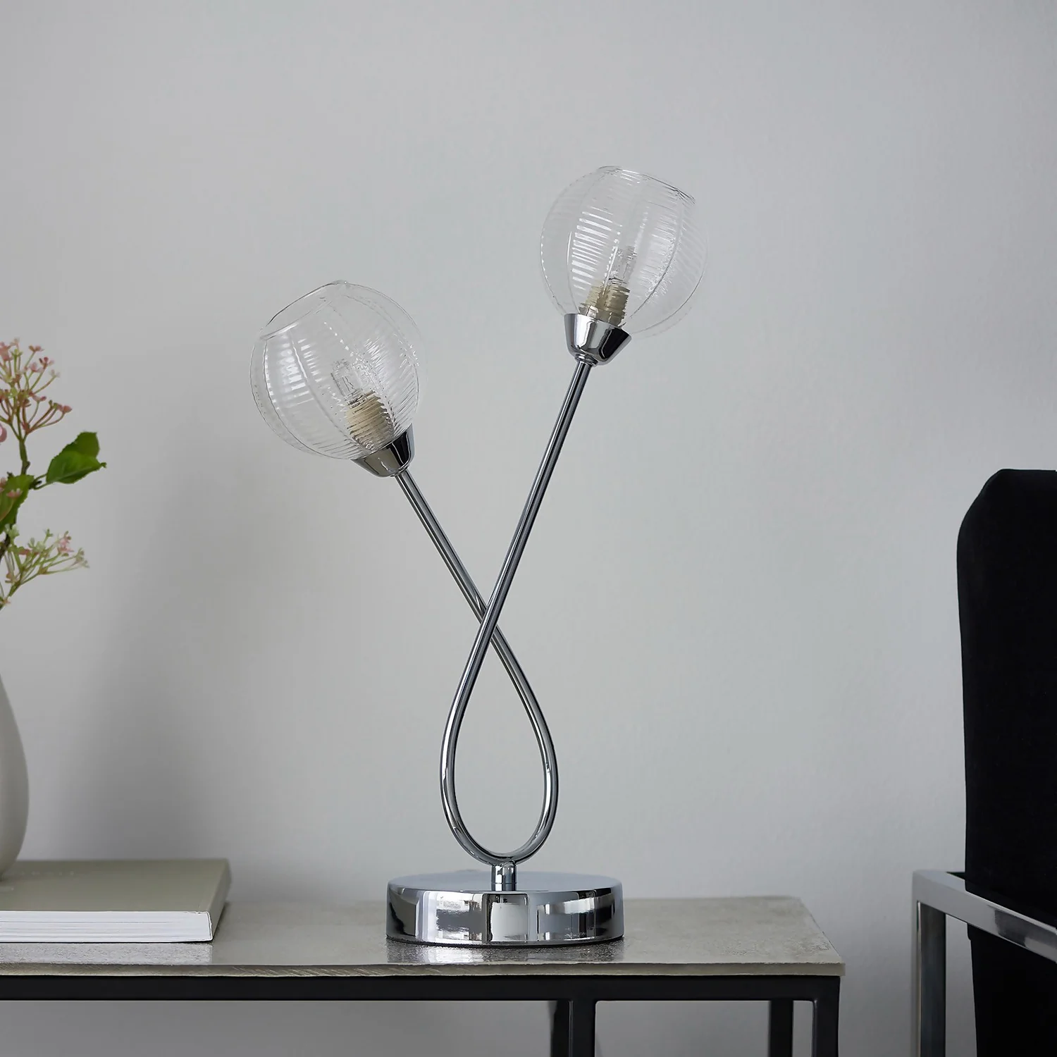 A lovely modern scluptural table lamp, with inline on/off switch. Chrome plated with complementary clear ribbed glass which creates a beautiful light effect when lit.