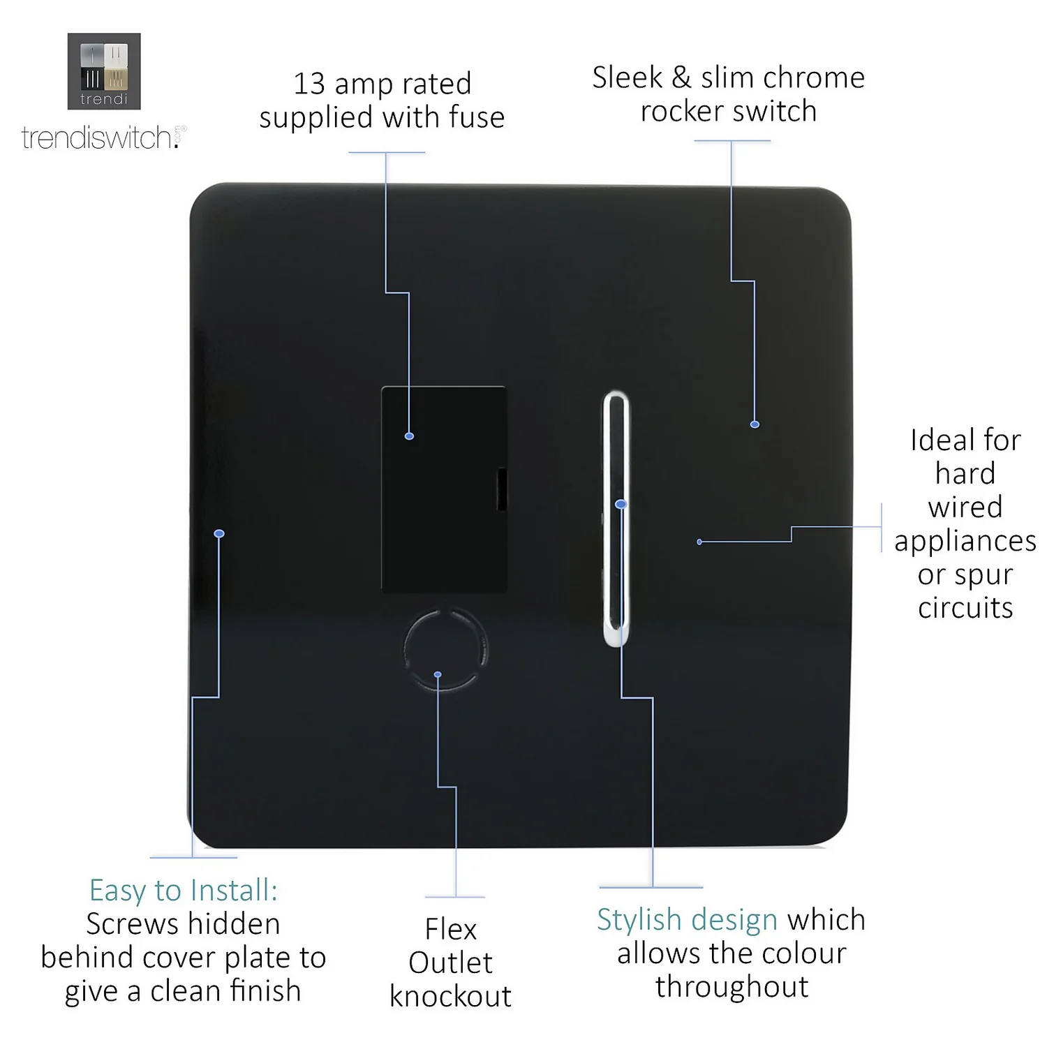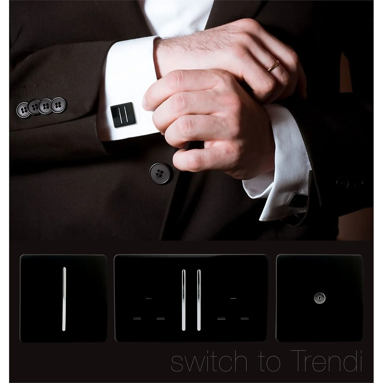 This model features a Gloss Black Finish and is part of the full Trendi Switch range. Operated by a long designer chrome vertical Rocker Light Switch, it not only looks good, but is nice and easy to locate and flick on and off.